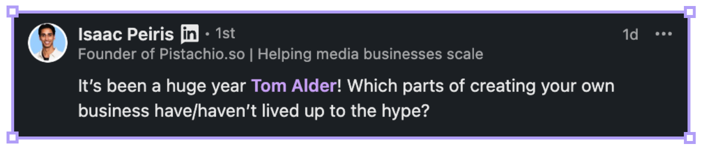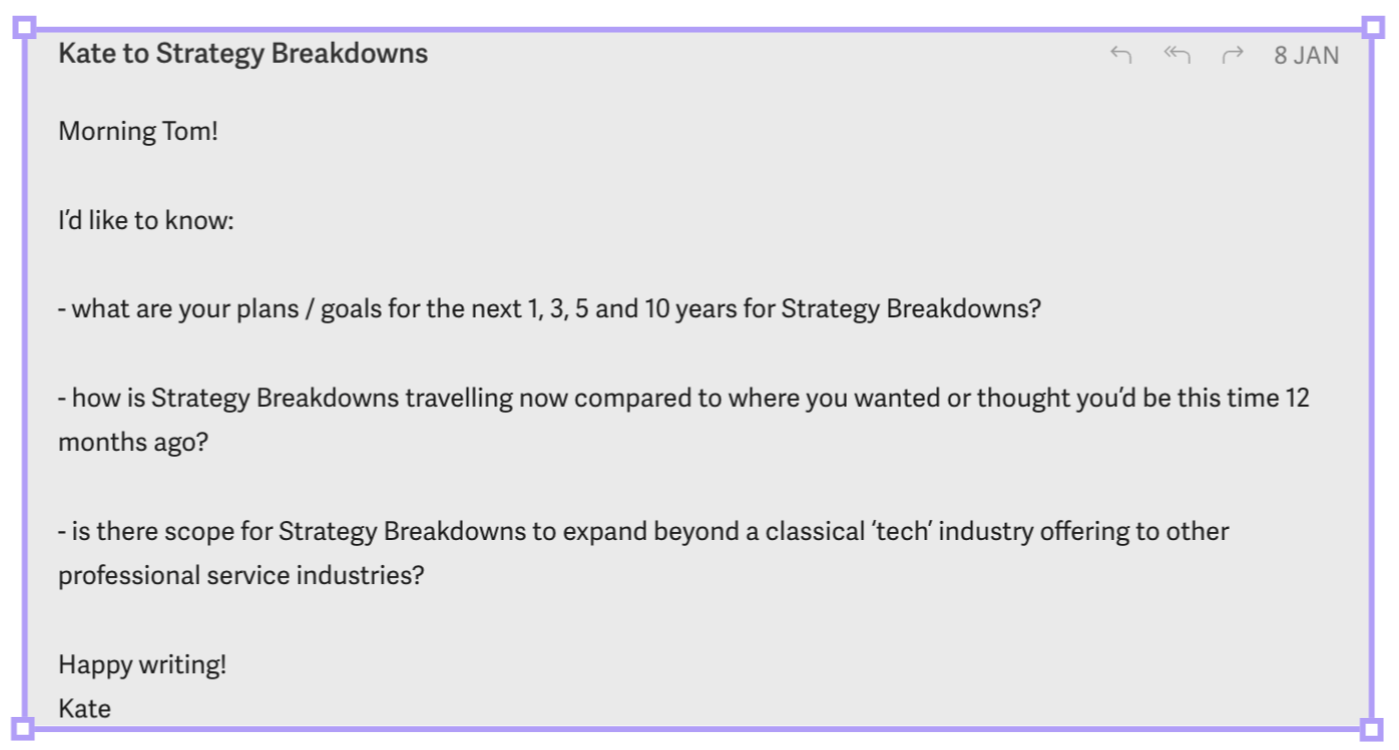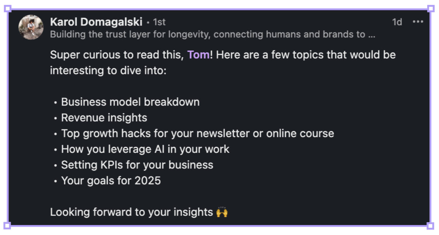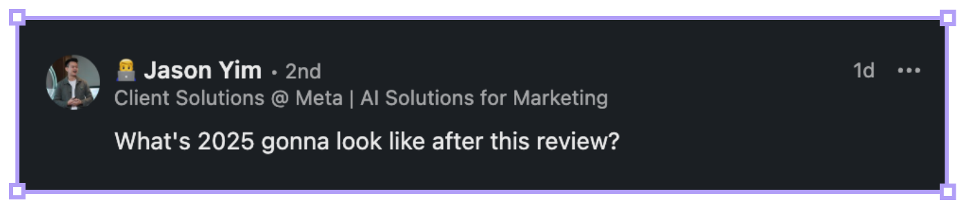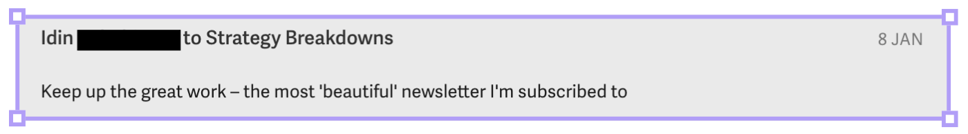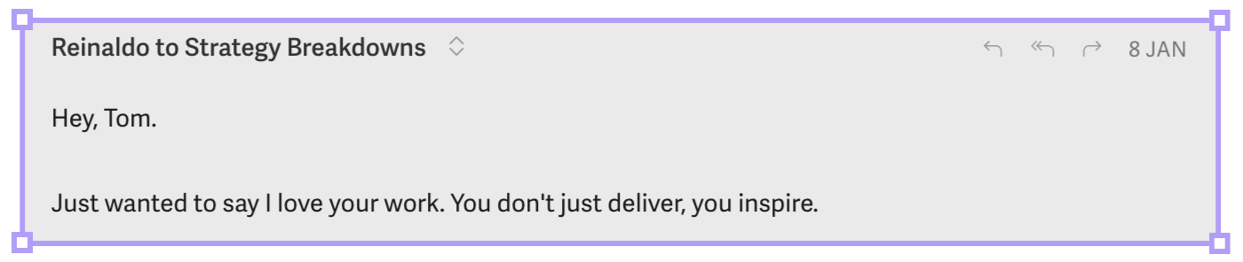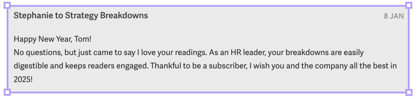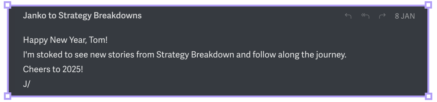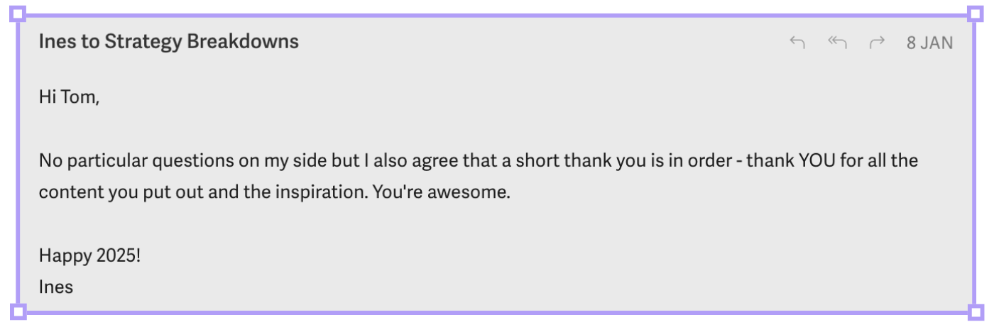 P.S. Loom lets you react and comment to videos at specific timestamps, which makes it pretty interesting as a creative medium.If a moment in a video resonates with you, drop a reaction or comment with any thoughts / questions / links to relevant content.My hope is that as more comment threads get added over time, this page becomes a living conversation, and each subsequent reader's experience is increasingly valuable.In parallel, Strategy Breakdowns will continue to evolve, and we'll get to see how the ideas in these point-in-time videos pan out.I'll be checking back here in 2030 to see if this aged well ✌️Published on Tuesday 14th Jan 2025.